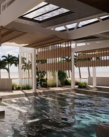Rund um das Becken befinden sich Whirlpools zum Entspannen, Duschen und Massagedüsen, die den Körper straffen.